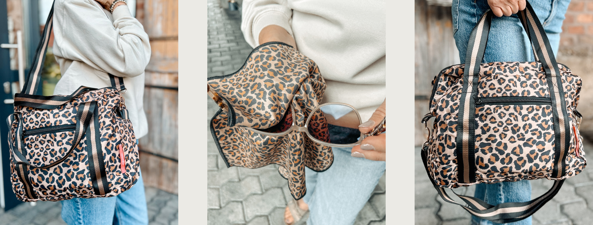 Und weil wir gerade beim Thema Taschen sind: Wir haben inzwischen so viele im Lädchen – große, kleine, fröhliche, schlichte – aber eine, die ich besonders gerne mag, ist die Easy City Bag "Leo" von Cedon. Sie ist nicht nur schön wild gemustert, sondern auch richtig durchdacht: viele Innen- und Außentaschen, abnehmbarer Gurt, wasserabweisend und waschbar. Und es gibt sogar das passende Brillenputztuch dazu – ich liebe solche Details!