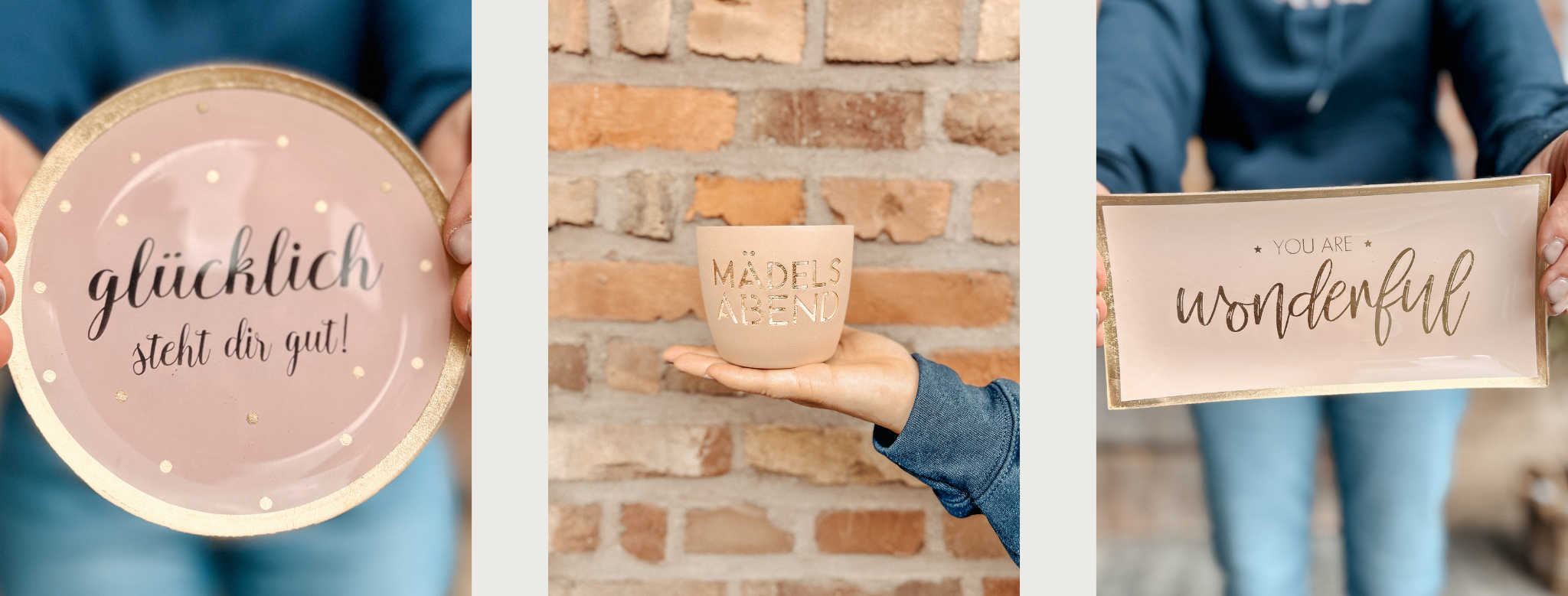 Manche Dinge brauchen keine großen Worte – sie zaubern ein Lächeln, einfach weil sie von Herzen kommen. So wie unsere kleinen Glasteller und Windlichter: liebevolle Kleinigkeiten mit feinem Gespür für den richtigen Moment. Ob als Dankeschön, zum Geburtstag oder einfach so – sie tragen Botschaften wie „Mädelsabend“, „Statt Blumen“ oder „Schön, dass es dich gibt“.
